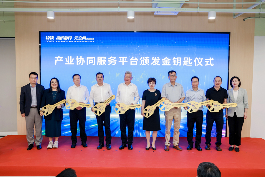 现场举行了产业协同服务平台颁发金钥匙仪式,为首批入驻行业协会颁发象征开启未来、共担使命的“金钥匙”,标志着“视听静界·元空间”迈出构建超高清视听产业生态圈的重要一步。同时,市北高新与金融机构共同启动金融生态共振计划,将构建起覆盖企业发展全周期的金融服务生态,为超高清视听产业注入金融动能。
